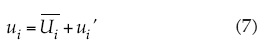 Para considerar la turbulencia, los valores de la velocidad se aplican como la adición de un valor medio y una componente fluctuante denominada descomposición de Reynolds (7), en la dirección i: