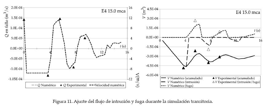 El ajuste del modelo CFD para la simulación transitoria se hace con los caudales que atraviesan el fallo y mediante la intrusión acumulada al final del transitorio. Se hace la validación con cinco instantes a partir de las imágenes captadas con el video de alta definición. Los volúmenes experimentales se obtienen de los niveles máximos y mínimos alcanzados durante las oscilaciones de presión, y se calculan los valores de intrusión y de fuga. En la figura 11 (izquierda) se observa la relación del caudal a través del fallo y su velocidad con respecto al tiempo de simulación. En la figura 11 (derecha) se presenta el volumen de intrusión, de fuga y el acumulado durante el transitorio. Los valores negativos representan el flujo de intrusión y, los positivos, el de fuga.