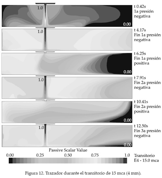 Con base en el criterio de Nash-Sutcliffe, el modelo numérico representa de manera satisfactoria el evento de intrusión durante un transitorio de presión. El volumen de intrusión acumulado es de 0.00034 m3. Si se toma en cuenta este volumen acumulado durante el tiempo del transitorio, se genera un caudal de intrusión al final del transitorio de 2.8 × 10-5 m3/s, el cual representa el 1.1% del caudal de circulación en condiciones de operación para la carga inicial de 15 mca. Este volumen de intrusión, a pesar de ser pequeño, puede ser considerablemente contaminante cuando la intrusión presenta cargas patógenas. La figura 12 muestra la configuración del trazador en los picos de presión durante el evento transitorio mediante el modelo CFD.