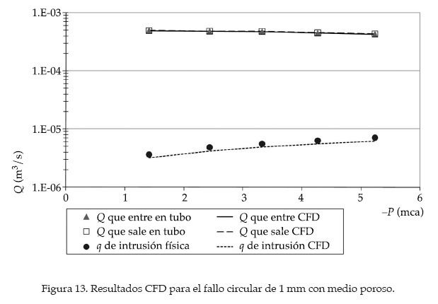 Para observar la validación de los resultados obtenidos para el evento de intrusión, considerando el medio poroso exterior, se muestran los ajustes con las simulaciones experimentales (figura 13). En la gráfica se observan los valores de presión y caudal de intrusión para cada escenario; los valores puntuales son los medidos físicamente y las líneas son los resultados del modelo CFD.