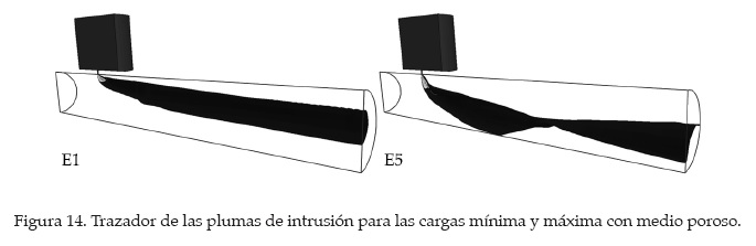 De igual forma se cuantifica el ajuste del modelo CFD al modelo físico mediante el coeficiente de Nash-Sutcliffe para los cinco escenarios de presión negativa que se simularon. Para el caudal de intrusión, el coeficiente presenta un valor de 0.30, suficientemente ajustado. La simulación que se realiza con el medio poroso exterior genera una reducción del caudal de intrusión de alrededor del 50% respecto a la intrusión cuando no se tiene el medio poroso. En la figura 14 se muestran las plumas de intrusión para la carga mínima de intrusión y la carga máxima con el medio exterior poroso.