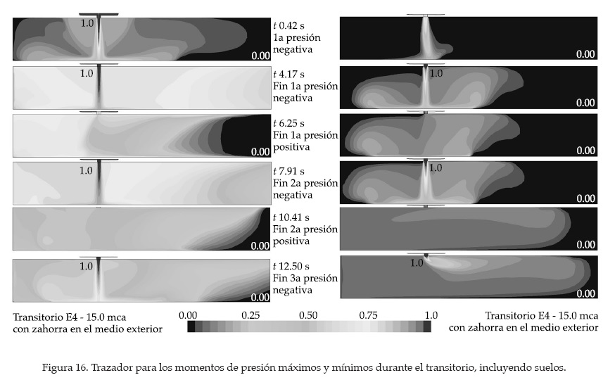 Dependiendo de las características del suelo exterior, la variación de la intrusión se presenta hasta en un 93%. Aun con el suelo más compacto (zahorra), el volumen de intrusión puede ser un problema de calidad, dependiendo de la concentración del contaminante. En la figura 16 se muestra la configuración de la intrusión por medio de un trazador durante el transitorio.
