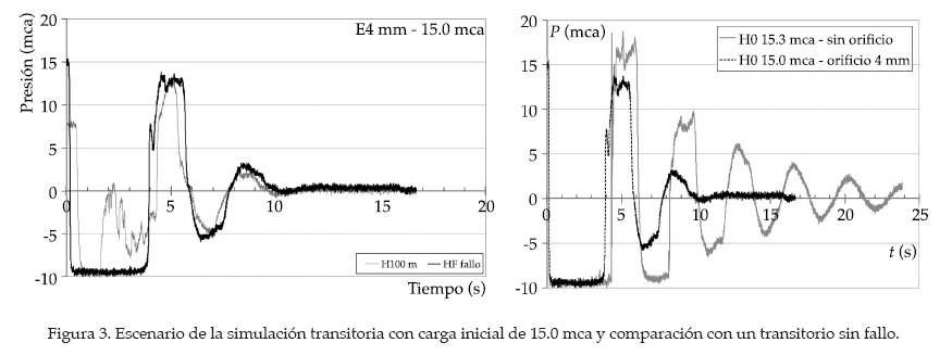 En la figura 3 (izquierda) se muestra el registro de la presión en la zona del fallo y a 100 m de la instalación se observa la presión negativa hasta el punto de cavitación, y las oscilaciones de presión durante 12.5 s. En la figura 3 (derecha) se tiene una comparación entre un transitorio sin orificio y el transitorio con el orificio de 4 mm; se observa el efecto de amortiguamiento provocado por el fallo; cuando no se tiene el fallo, se presentan más oscilaciones de presión y la duración del transitorio es mayor.