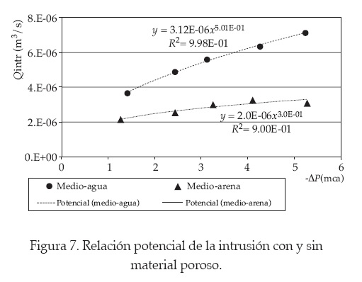 Se generan cinco escenarios de presión, en un rango de -1.3 a -5.3 mca; se tiene una carga exterior de 0.37 m. Con la relación potencial entre el caudal (Q) y el diferencial de la presión (P), se valida el modelo numérico. En la figura 7 se muestran los resultados del potencial de intrusión con y sin suelo en el medio exterior.