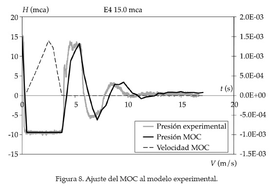 La celeridad se obtiene de diversos ensayos en la instalación en condiciones originales; el valor medio de la celeridad es de 240 m/s. La simulación del MOC se hace con un paso de tiempo de 0.417 s. En la figura 8 se muestra el ajuste del modelo numérico al resultado experimental; con el resultado de la simulación se obtiene una relación entre la presión y la velocidad para cada paso de tiempo en la sección de tubería donde se encuentra el fallo. Con estos resultados se termina la primera etapa del modelo numérico y así se tienen las condiciones de frontera en cada paso de tiempo para la etapa del modelo numérico CFD.