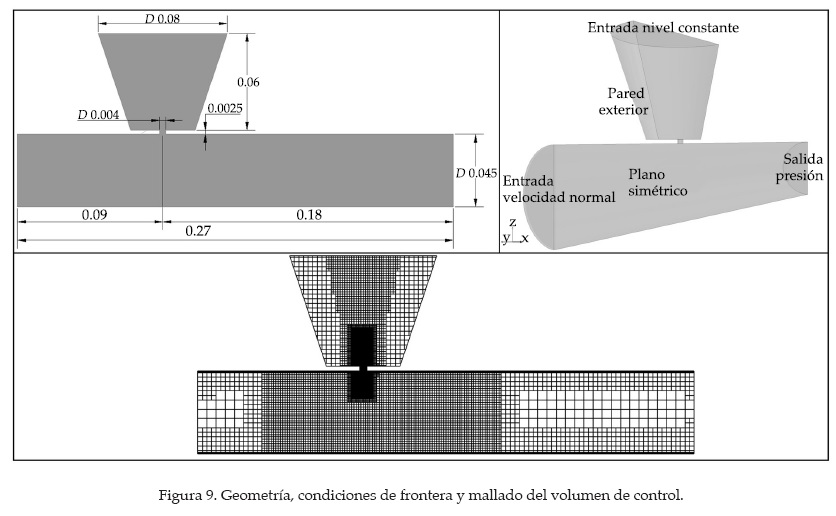 La aplicación del modelo CFD se lleva a cabo con las características físicas del agua a temperatura media, similar a la de los ensayos experimentales; se trabajó con densidad de 997.56 kg/m3, viscosidad dinámica de 0.89 × 10-3 N·s/m2 y viscosidad cinemática de 0.89 × 10-6 m2/s.