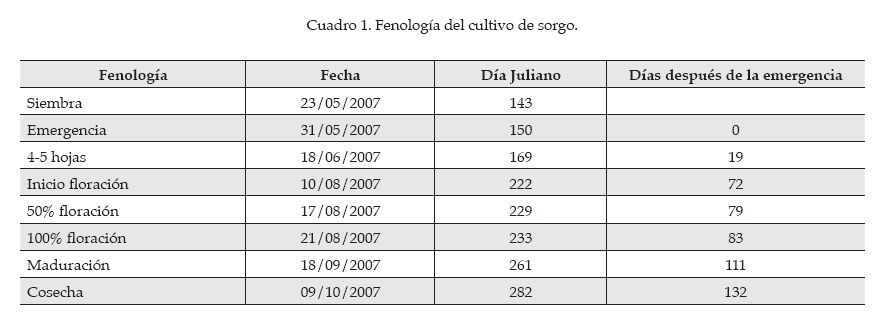El sorgo dulce es un híbrido de ciclo medio-tardío, con gran capacidad de adaptación a climas áridos y semiáridos, y que alcanza rendimientos medios de 20 a 30 t de materia seca ha-1 y una altura promedio de cuatro metros. La siembra se llevó a cabo el 23 de mayo y la cosecha el 8 de octubre de 2007. La densidad de siembra fue de 20 semillas m-2, con un marco de plantación de 50 x 10 cm. La densidad final de plantas fue de unas 115 000 plantas ha-1. El cuadro 1 presenta la fenología del cultivo de sorgo.