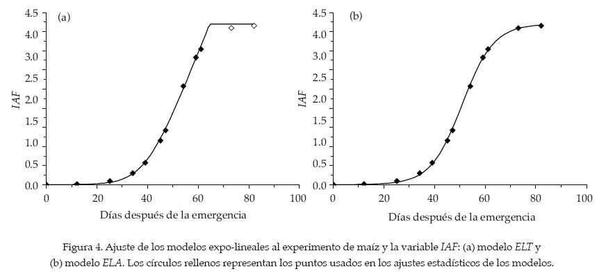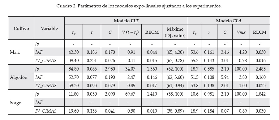 Los modelos ELT y ELA fueron ajustados a los datos experimentales usando regresión no lineal, donde la raíz del error cuadrático medio (RECM) fue minimizada. Para esto se utilizó la función SOLVERMR del software ExcelMR. La figura 4 muestra el ajuste estadístico de los dos modelos expo-lineales a la variable IAF del cultivo de maíz. El cuadro 2 muestra los resultados de los modelos expo-lineales ajustados a fv, IAF e IV_CIMAS de los tres cultivos analizados. En general, ambos modelos expo-lineales presentaron un buen ajuste estadístico y representan la dinámica del crecimiento asociada con el IAF.