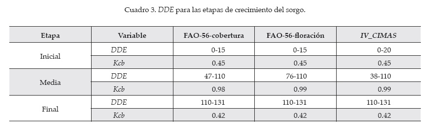 Usando la información de Kc (Doorenbos y Kassam, 1979) y Kcb (Allen et al., 1998), se estimaron los Kcb del sorgo dulce de FAO-56, corregidos por la humedad relativa, velocidad del viento y altura del cultivo medida en campo (Allen et al., 1998). El cuadro 3 muestra los parámetros utilizados para las etapas de crecimiento del sorgo, definidas por un valor de Kcb para un tiempo dado (días después de la emergencia o DDE).