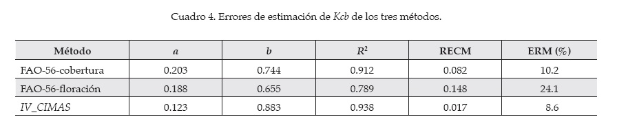 Del análisis de los parámetros del cuadro 2, las estimaciones de tT usando el IAF y el IV_CIMAS resultan muy cercanas entre sí, lo cual expresa que el IV_CIMAS ha sido diseñado con base en una relación lineal con el IAF, con origen en 0 (Romero et al., 2009). En el caso de la fv, los valores de tT son diferentes a los del IAF e IV_CIMAS. Esto puede explicarse debido a que la fv es función de un corte bidimensional del follaje (vista aérea), a diferencia del IAF y el IV_CIMAS, que lo considera en términos tridimensionales. Así, en términos de Kcb, el uso de fv tiene limitaciones en relación con la estimación de la evapotranspiración, ya que es una medida restringida de la cantidad de estomas del follaje.