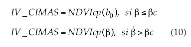 donde βc es un valor umbral; por lo general, βc = 0.25. El NDVIcp(β) se estima de la relación entre b0 y β de la relación (8) y la relación (7) del NDVIcp con b0. El índice β se estima usando los valores del R e IRC medidos en campo (Romero et al., 2009), al igual que el NDVIcp(b0).