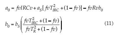 Las variables biofísicas fv e IAF son función del follaje "verde" de los cultivos, por lo que resulta difícil su modelación en el nivel de curva de crecimiento completa, dada la presencia de hojas parcialmente verdes o amarillentas en la etapa de senescencia. Por otra parte, sólo incorporan criterios de cantidad y no consideran las propiedades de la hoja como el control estomático. El IV_CIMAS está basado en las relaciones entre los parámetros a0 y b0 con las propiedades biofísicas de los cultivos, según lo establecido por Yoshioka et al. (2000) en la ecuación (11):