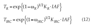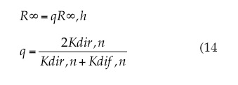 donde K es un coeficiente de extinción, dir se refiere a radiancia directa, dif a radiancia difusa, n a hojas negras (absorbentes), h a hojas con distribución angular horizontal y R se refiere a cualquier banda espectral (R o IRC). La relación (15) sólo es válida para el caso de hojas donde la transmitancia foliar es igual a su reflectancia.