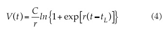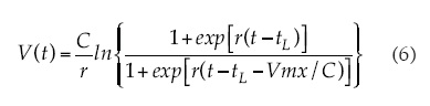 donde V es el crecimiento de la vegetación (IAF, fv, h); r, una tasa relativa de crecimiento; C, la tasa máxima de crecimiento, y tL es el tiempo cuando V(t) = Vt = 0) en la fase lineal, es decir, el tiempo en que la fase lineal empieza en forma efectiva.