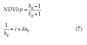 El índice de vegetación NDVI [(IRC - R)/(IRC + R)] (Rouse et al., 1974) trata de aproximar los cambios de las variables biofísicas asociados con cambios en la pendiente de las líneas de igual vegetación (iso-IAF), suponiendo un origen común de todas las líneas en (0, 0). Paz et al. (2007) proponen el índice NDVIcp, que aproxima la parte exponencial entre a0 y b0 mediante una línea recta en el espacio transformado a0 - 1/b0. El NDVIcp queda definido como: