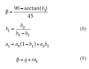 Posteriormente, Romero et al. (2009) propusieron el uso de los patrones del crecimiento espectral para modelar el patrón completo de la figura 3b (pendientes b0 y β) mediante el índice IV_CIMAS. Este índice modela la fase exponencial mediante el NDVIcp. Para aproximar la fase lineal hasta un poco después de la transición a la exponencial utiliza un espacio transformado a1 - β (Paz et al., 2005) (ecuación (8)). De esta forma, se define una relación lineal, donde q y r son constantes empíricas (ecuación (9)):