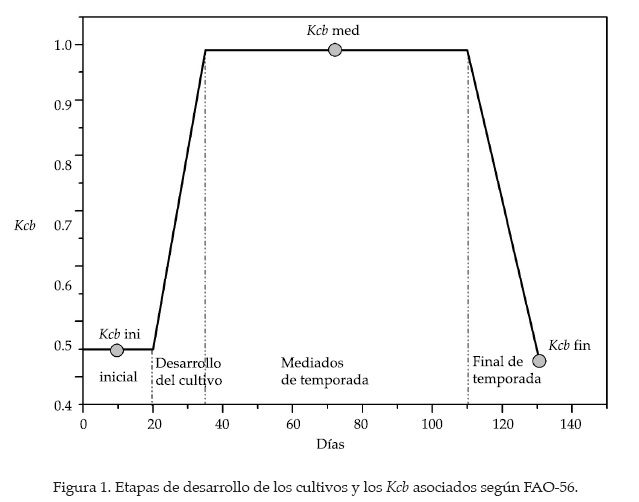 FAO-56 ha desarrollado valores de Kcb para las etapas de crecimiento inicial (ini), media (med) y final (fin) de distintos cultivos en condiciones estándar (Allen et al., 1998). Para poder utilizar estos valores, es necesario caracterizar el inicio y la duración de las etapas de crecimiento de los cultivos, como se muestra en la figura 1.