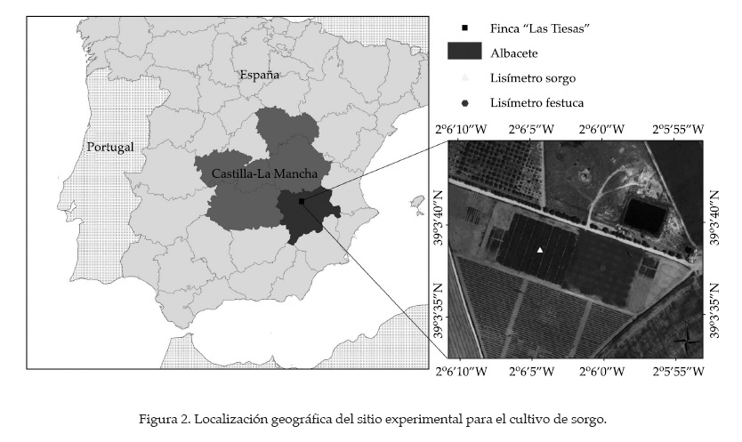 Las medidas espectrales y de variables bio-físicas (Bm, h y fv) del sorgo, se realizaron en el Instituto Técnico Agronómico Provincial de Albacete, en España, con coordenadas geográficas: 2º 5' 10'' longitud oeste, 39º 14' 30'' latitud norte y altitud sobre el nivel del mar de 695 m (figura 2). El clima local se clasifica como semiárido (D), mesotérmico (B'2), con nulo o escaso exceso de humedad (d), y con moderada concentración de necesidades de agua en verano (b'3) (Thornthwaite, 1948), con temperaturas medias del mes más frío (enero) de 4-5 ºC y del mes más cálido (julio) de 24 ºC, aproximadamente. La precipitación media anual es 320 mm año-1. Según el Soil Taxonomy (Soil Survey Staff, 2006), el suelo de la parcela experimental se cataloga como petrocalcic calcixerepts. La profundidad media del suelo es de 40 cm, limitado por el desarrollo de un horizonte petrocálcico que se encuentra más o menos fragmentado. La textura es franco arcillo limosa (13.42%, arena; 48.89%, limo; 37.69%, arcilla), pH básico, pobre en materia orgánica y en nitrógeno total, con un alto contenido en caliza activa y potasio.