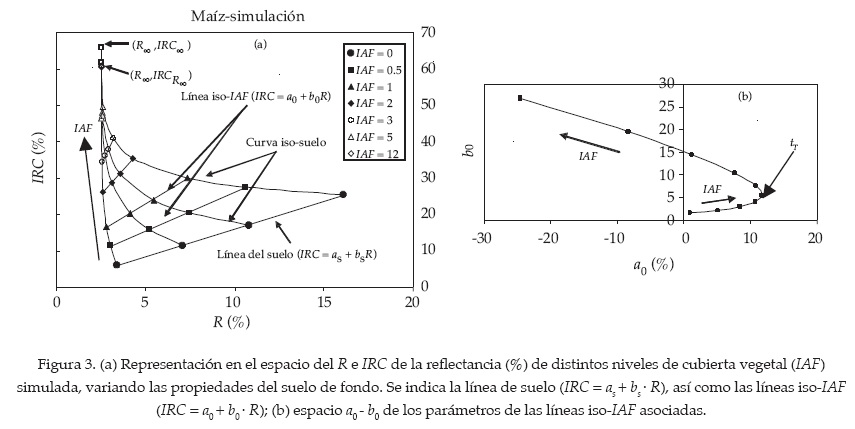 Los patrones espectrales en el espacio del R-IRC, asociados con el crecimiento del cultivo, pueden utilizarse para desarrollar índices de vegetación óptimos (Gilabert et al., 2002; Paz et al., 2007; Romero et al., 2009). La figura 3a muestra simulaciones radiativas asociadas con el incremento del IAF, usando diferentes propiedades ópticas (reflectancias) de los suelos. Paz et al. (2005) hace una descripción detallada de estas simulaciones. Se observa que las curvas iso-suelo, formadas por vegetación creciendo sobre propiedades ópticas constantes del suelo, convergen hasta un punto (ápice del "sombrero de tres picos"), donde la reflectancia del R no cambia, porque se ha saturado. Este punto representa un medio ópticamente denso o de reflectancia en el infinito (R∞) (Ross, 1981).