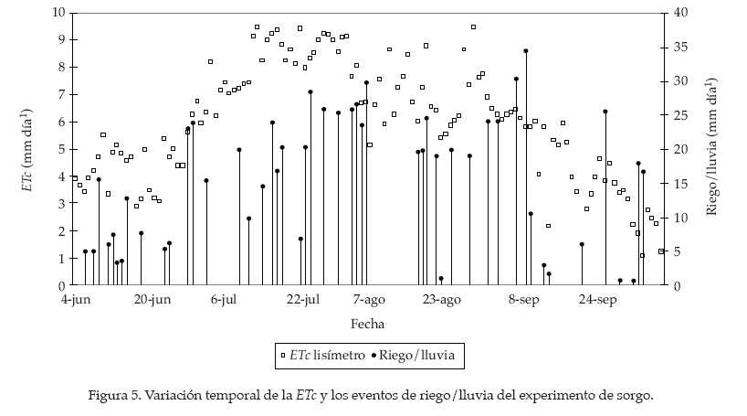 La evapotranspiración del sorgo dulce se estimó a partir de los datos de peso del lisímetro, donde se usaron datos horarios para obtener el valor diario de agua evaporada. Cuando no se pudo obtener el valor diario por diferentes motivos (lluvia, riego, corte del césped), se hizo un promedio entre el valor anterior y siguiente a ese día. Otras fuentes de error que condujeron a la eliminación de datos fueron las siguientes: la verificación del peso, calibraciones por pérdida de contacto en la celda de carga, baja de voltaje en el sistema, pérdida de contacto del cable a tierra y falla en el registro de datos (López-Urrea et al., 2006). La figura 5 muestra la ETc calculada y los eventos de riego/lluvia durante el ciclo de crecimiento del sorgo.