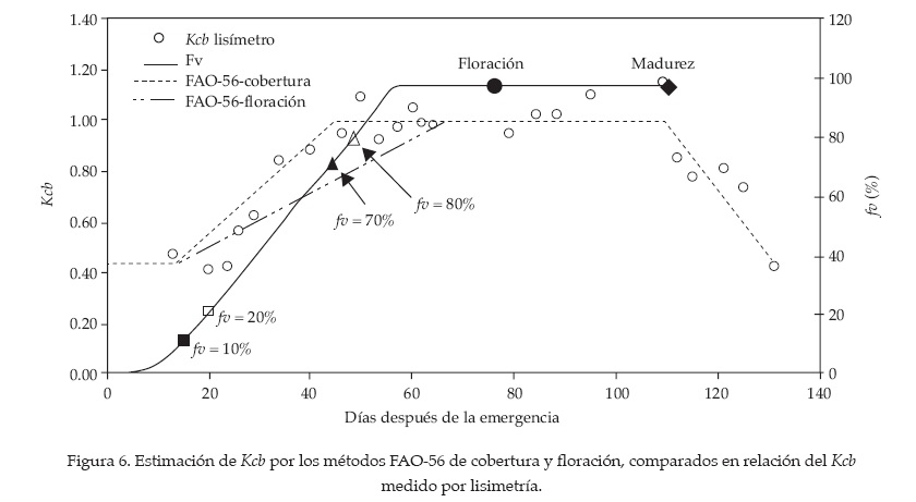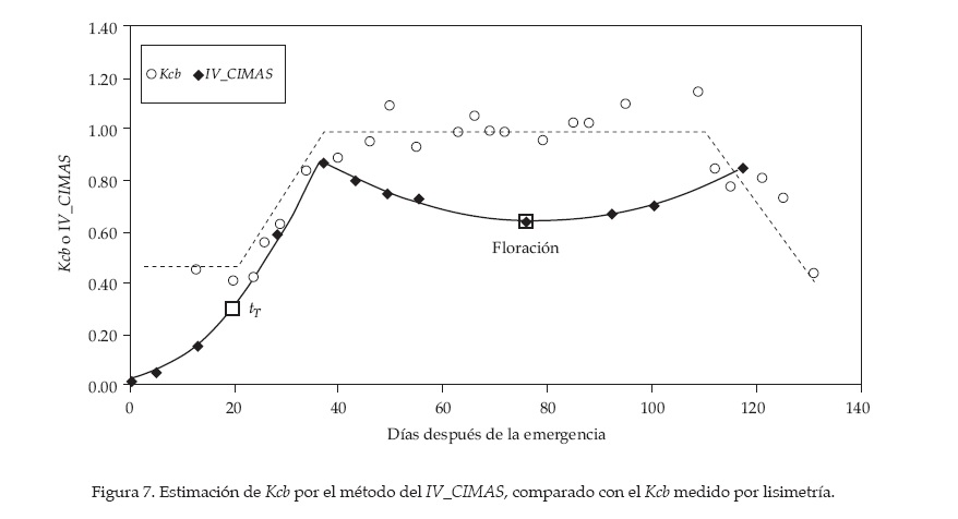 La figura 6 muestra el Kcb medido por lisimetría y el estimado por dos métodos, FAO-56-Cobertura y FAO-56-Floración, usando los valores del cuadro 3. En la figura 7 se observa el Kcb estimado por el método del IV_CIMAS.