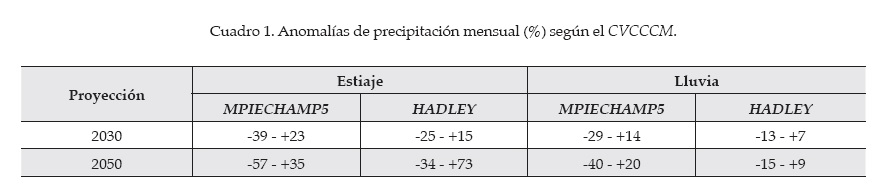 La DGCOH (2007), a partir de bases de datos históricos, reporta que la precipitación acumulada anual en Xochimilco para el periodo de 1951 a 1980 pasó de 838 a 681 mm (-17%) para el periodo de 1981 a 2007, y que el 90% de la precipitación ocurrió durante los meses de mayo a octubre; además, para la temporada de estiaje (noviembre a abril), la precipitación media mensual fue de 13 a 11 mm, y para la temporada de lluvia (de mayo a octubre), de 118 a 100 mm, respectivamente, en los periodos mencionados. Por su parte, Jáuregui (2001) encontró que los eventos extremos de precipitación (> 45 mm) para el primer periodo tuvieron una frecuencia de cinco a siete casos por mes, siendo de 20 a 28 eventos en los meses de junio y septiembre. Este mismo autor señala que por el fenómeno de "islas de calor", provocado por el crecimiento urbano, si bien la precipitación acumulada anual y la mensual ha disminuido, en contraste, los eventos extremos ocurridos en 24 horas se han duplicado en los últimos treinta años. Tal situación podría agravarse a causa del cambio climático (Landa et al., 2008). Sin embargo, dadas estas mismas condiciones tanto de cambio global como de variabilidad climática local, es muy complejo determinar el grado de variación proyectado a futuro (Jáuregui, 2005) y Bates et al. (2008) mencionaron que para el escenario A2 de emisiones de gases de efecto invernadero, más allá de estos resultados, hay escasa concordancia entre modelos en cuanto a la variación de la frecuencia de los eventos de precipitación extrema. Esto último se ve reflejado en las proyecciones a futuro realizadas para la precipitación por el Centro Virtual de Cambio Climático de la Ciudad de México (CVCCCM), a través de los modelos MPIECHAMP5 y HADLEY, para el escenario mencionado, que es el más probable para México, las cuales indican que la anomalía de precipitación en ambas temporadas, de estiaje y lluvias, es muy fluctuante, presentándose las anomalías mayores en agosto (-25%) y en septiembre (+25%), cuando ocurre cerca del 40% de la precipitación en el año, como se muestra en el cuadro 1 (CVCCM, 2011).