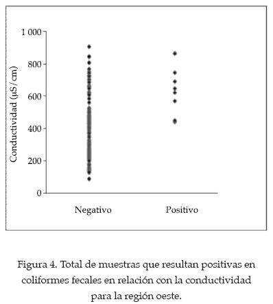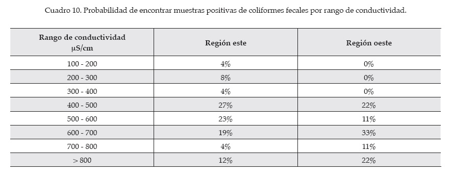 En el caso de la región oeste, no se encontraron coliformes fecales para valores de conductividad menor a 400 µS/m, en comparación con el 7% para valores entre 400 y 700 µS/m, y el 14% para valores mayores a 700 µS/m (figura 4 y cuadro 10).