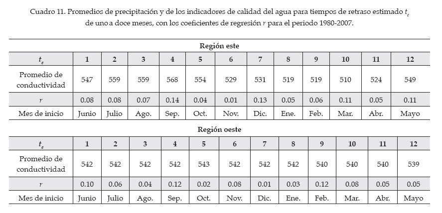 Al relacionar las bases de datos mensuales de precipitación y de los indicadores de calidad del agua de interés, el tiempo de retraso estimado (te) que presentó el máximo coeficiente de correlación r se observó para cuatro meses en ambas regiones; aunque en la región oeste se observa que con un tiempo de respuesta de nueve meses también existe un coeficiente de regresión alto; además, se obtuvo el mayor promedio para el caso de la conductividad en la región este, sin cambios apreciables en la región oeste (cuadro 12).