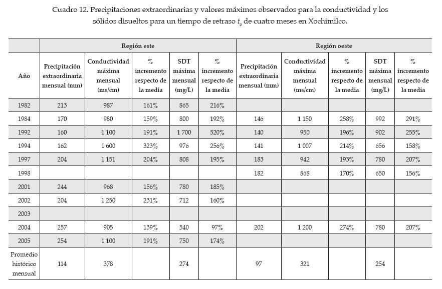 Se identificaron valores de precipitación mensual superiores a 180 mm y se compararon con los valores de conductividad y de SDT. Para un tiempo de retraso (to) de cuatro meses, se apreciaron incrementos hasta por arriba del 60% de los indicadores de calidad del agua en relación con los promedios históricos (cuadro 11). Asimismo, no se encontraron valores de precipitación mayores a 180 mm en las temporadas de estiaje.