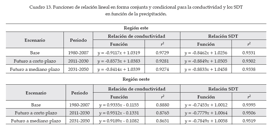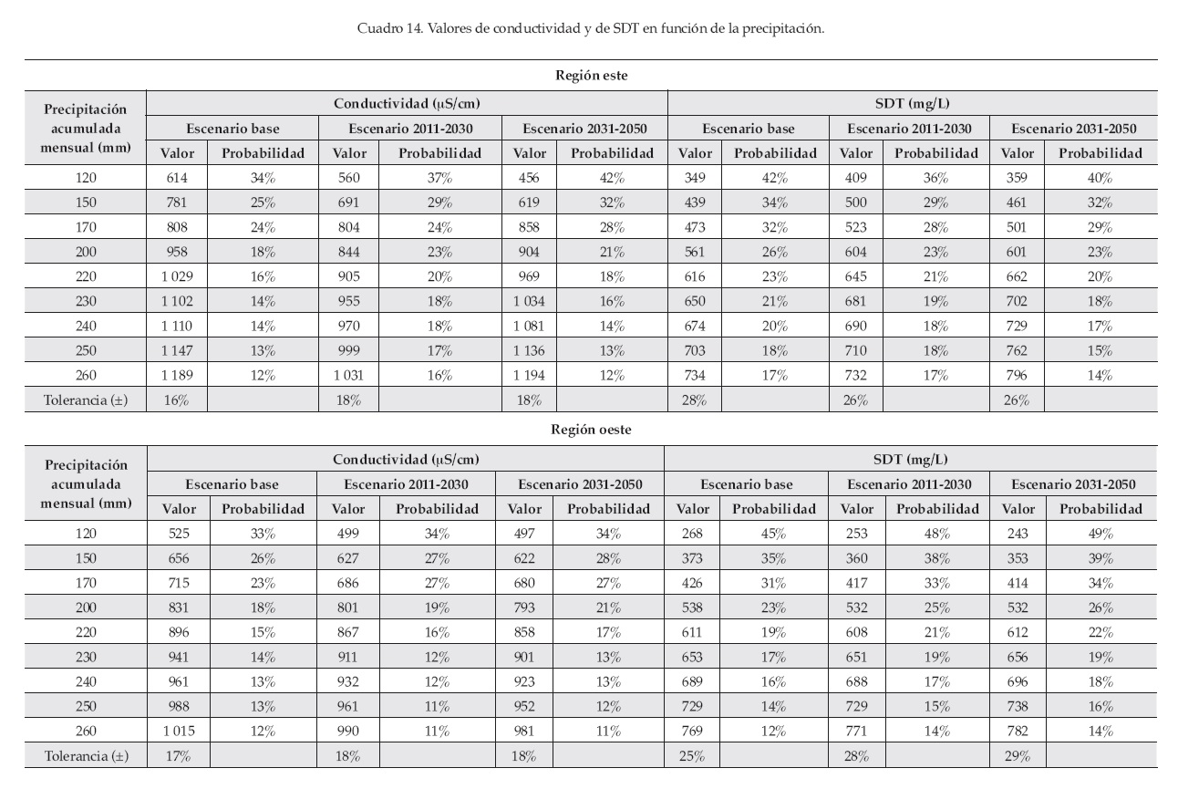 Para la región este, resultó que y = F (cond|hp), x = F(hp), o bien y = F(SDT|hp) y x = F(hp|SDT); para la región oeste, y = F(cond|hp), x = F(hp|cond), o bien, y = F(SDT|hp) y x = F(hp|SDT). Donde cond es la conductividad (µS/cm), SDT son los sólidos disueltos totales (mg/L), y hp es la precipitación (mm). Con el empleo de los parámetros de las funciones resultantes y con el uso de la ecuación (7), se vincularon las relaciones conductividad-lluvia y SDT-lluvia, por medio de la función Gumbel mixta, esto para condiciones del escenario base (1980-2007) y de cambio climático a corto y mediano plazos (2011-2030 y 2031-2050). Los resultados se muestran en el cuadro 14.