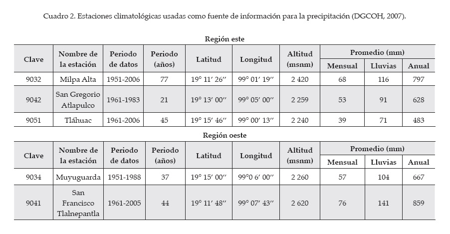 Para este estudio se emplearon datos de precipitación mensual (mm) y de los indicadores de calidad del agua conductividad (µS/cm) y sólidos disueltos totales (mg/L) del periodo de 1980 a 2007. Las bases de datos originales de precipitación fueron obtenidas del sistema CLICOM, proporcionado por la DGCOH (2007), que fueron recopiladas de cinco estaciones climatológicas. De éstas, tres se ubican en la región oeste (Milpa Alta 9032, San Gregorio Atlapulco 9042 y Tláhuac 9051) y dos en la región este (Muyuguarda 9034 y San Francisco Tlalnepantla 9041) (cuadro 2).