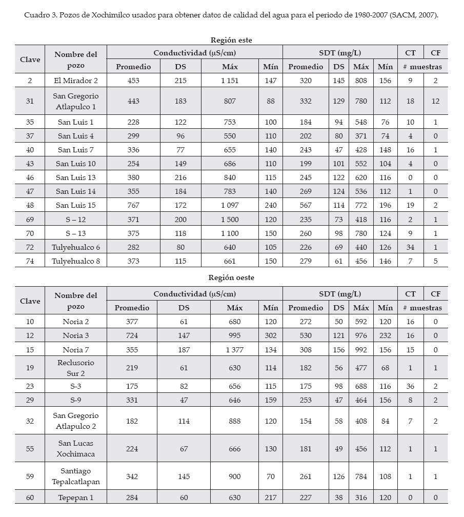 En cuanto a los datos de calidad del agua, a partir de los reportados entre 1980-2007 en los 79 pozos de Xochimilco, se observa que en general la calidad es buena, con presencia ocasional de coliformes fecales (SACM, 2007). La alta dispersión para algunos parámetros posiblemente obedezca a los pocos datos que se colectan, es por ello que se hicieron análisis con distintos parámetros y se consideró que se contaba sólo con datos suficientes para la conductividad y los SDT; para el resto se cuenta con menos de diez datos por mes y menos de veinte años de registro. De esta manera, se seleccionaron 23 pozos (cuadro 3) de 79 existentes en la delegación Xochimilco, por contar con el mayor número de datos para los indicadores de interés. De éstos, 13 pozos se encuentran en la región este y 10 en la oeste. Los primeros fueron perforados cerca de los límites con Tláhuac e Iztapalapa, a profundidades de 200 a 400 m y con niveles piezométricos de 10 a más de 85 m. Los diez pozos de la región oeste se encuentran cerca de la sierra del Chichinautzin, a profundidades de 90 a 250 m, y cuentan con un nivel piezométrico de 40 a 120 m. Estas bases contienen datos de coliformes fecales y totales, conductividad y sólidos disueltos totales, entre otros (SACM, 2007).