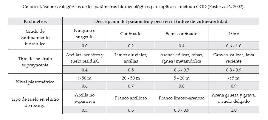 Para evaluar la vulnerabilidad se empleó el método GOD, que identifica la susceptibilidad de un acuífero a la penetración de los contaminantes, a partir del grado de accesibilidad hidráulica como función de cuatro parámetros hidrogeológicos mostrados en el cuadro 4. El procedimiento consistió en identificarlos en un mapa a escala 1:20 000 y obtener su peso en una escala que va de despreciable a extrema. El índice de vulnerabilidad es el producto de los pesos obtenidos para cada parámetro y se clasificó de acuerdo con el cuadro 5 (Foster et al., 2002).