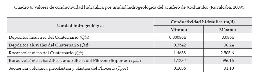 El coeficiente almacenamiento (S) en el acuífero de Xochimilco es un valor constante de 0.2 (1/m), la conductividad hidráulica (k) depende del tipo de unidad hidrogeológica, como se muestra en el cuadro 6, y el espesor del estrato (L) se muestra en la figura 2.
