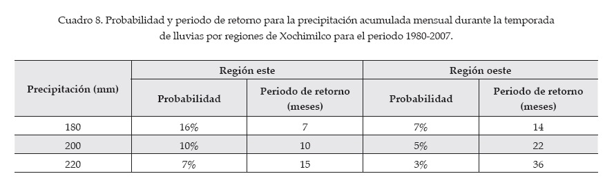 El análisis de los datos diarios de precipitación del periodo 1980-2007 indica que ésta fluctuó entre 7 y 10 mm en promedio, con 14 a 16 días de lluvia por mes. Sin embargo, no se observa un incremento significativo en los valores promedio de conductividad y de SDT cuando ocurren valores extremos de 45 mm de lluvia acumulada en un día (para t = 1.645 con α = 0.05, t0 = -0.0001 para conductividad y -0.002 para SDT en la región este, y de 0.004 y 0.003, respectivamente, para la región oeste para pvalue > 0.253). Lo que sí se observa es que la precipitación acumulada mensual para valores a partir del noveno decil (> 180 mm) son más probables cuando ocurrieron cuatro días consecutivos de eventos de precipitación extrema. Esta probabilidad varía entre 7 y 16% para la zona este (con periodos de retorno de 7 a 15 meses), y de 3 a 7% en la oeste (con periodos de retorno de 14 a 36 meses) (cuadro 8). El promedio de la precipitación acumulada mensual para la delegación fue de 105 mm, siendo de 114 mm para la zona este y de 97 mm para la zona oeste.