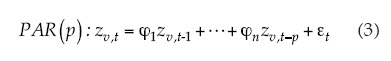 donde φ1 es un coeficiente de autocorrelación; zt, un valor estandarizado y normalizado, y εt es la componente aleatoria o residual del modelo. Esta componente es una función de la varianza de los residuales