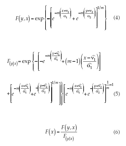 donde x e y son las funciones condicionales, conjuntas o marginales, según sea el caso de la relación elegida, y hp es la precipitación acumulada mensual (mm).