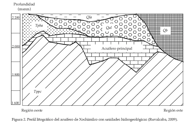 El acuífero principal se extiende en toda la planicie lacustre de Xochimilco hasta la zona montañosa del sur. Tiene un espesor aproximado de 400 m, a partir de los depósitos lacustres del Cuaternario y su frontera inferior corresponde a la cima de la secuencia estratigráfica del acuífero profundo. Es de tipo confinado por las zonas montañosas y semiconfinado hacia la parte central de la planicie por el acuitardo superior. A pesar de ello, se considera que este acuífero es libre y semiconfinado debido al efecto del bombeo que ha provocado que el nivel piezométrico descienda por debajo de la base del acuitardo superior, por lo que se establecieron condiciones de flujo rápido. Presenta una conductividad hidráulica (k) de 0.0001296 hasta 30.24 m/día. Dada la composición estratigráfica, la conductividad hidráulica (k) es muy variable, y el coeficiente de almacenamiento (S) es constante e igual a 0.20. Se estima que a este acuífero se infiltran 119 millones de metros cúbicos al año (3.78 m3/s) y se extraen 140 millones de metros cúbicos (4.4 m3/s) por medio de 79 pozos. La mayoría de la recarga se produce en la zona sur, debido a la alta permeabilidad del suelo y del acuitardo superior, lo que según Lesser (2003), por un lado favorece la infiltración, pero por otro facilita la penetración de contaminantes al acuífero principal. Este flujo de recarga se desplaza en forma lateral y descendente a través de basaltos fracturados hacia la zona norte del acuífero principal, esperando tiempos de retraso desde un mes hasta un año (Alley et al., 2010). Subyacente al acuífero principal se encuentra el acuífero profundo, el cual está formado por roca volcánica estratificada fracturada, pero esta capa tiene baja permeabilidad debido a la compresión entre estratos. El espesor promedio es de 200 m. La conductividad hidráulica (k) para el acuífero profundo es de 31.97 m/d y el coeficiente de almacenamiento (S) es de 0.05 (Ruvalcaba, 2009).