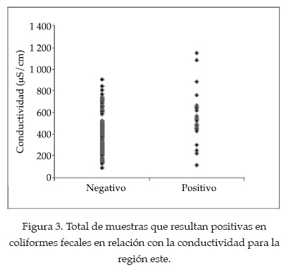 Se encontró que existe una relación muy estrecha entre la conductividad y los SDT, ya que se hallaron coeficientes de correlación superiores a r² = 0.8 en ambas regiones. En cuanto al contenido de coliformes fecales y los valores de conductividad, en la región este se halló que la probabilidad de que alguna de estas muestras resulte positiva es menor al 3% para valores de conductividad menor a 400 µS/m; del 18% para valores entre 400 y 700 µS/m, y hasta el 19% para valores mayores que 700 µS/m (figura 3 y cuadro 10).