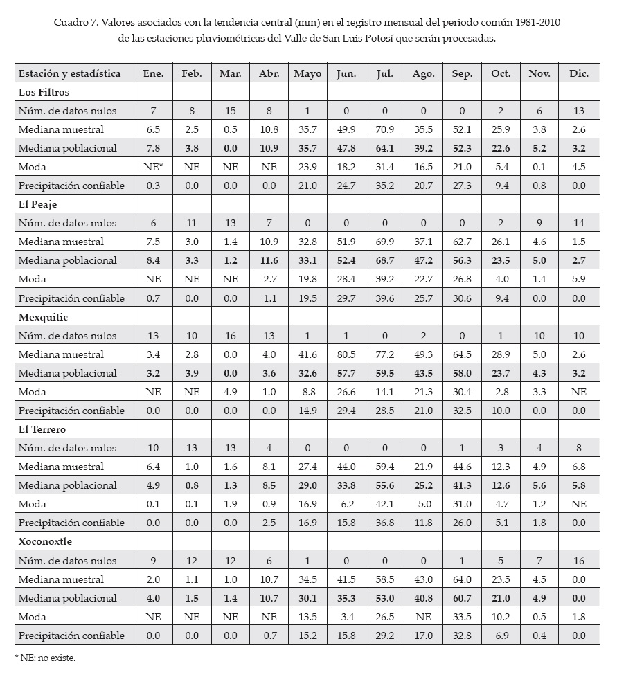 Se insiste en que sólo se procesan, por meses, todos los datos disponibles en el periodo de 1981-2010 para estimar los valores mensuales de la moda y de la precipitación confiable, definida esta última como la lluvia con probabilidad de excedencia del 75%. Tales estimaciones se realizaron ajustando a cada serie mensual disponible del dato faltante la distribución Gamma Mixta (Campos-Aranda, 2005). Por tratarse de un estudio de sequías, los valores buscados deben ser bastante confiables, así se aceptó la siguiente regla de selección: cuando existe la moda se adopta ésta, siempre y cuando no exceda a la precipitación confiable, de ser el caso, se adopta tal valor. Lo anterior se ilustra en el cuadro 4, con negritas para la estación Mexquitic, que es de las más incompletas.