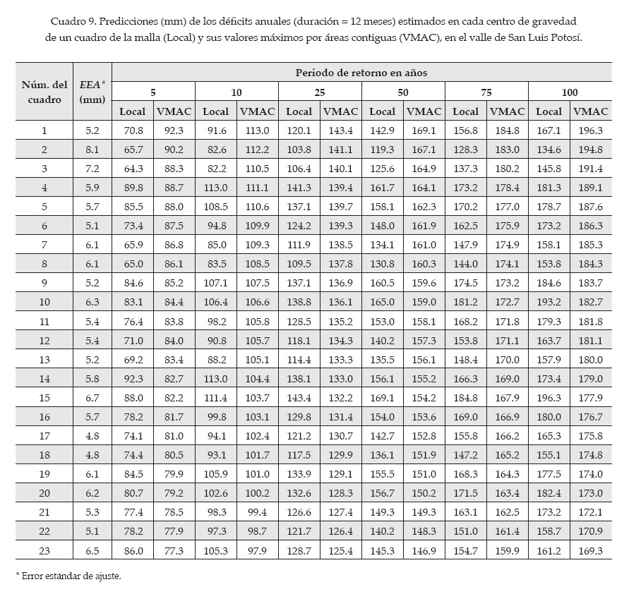 Cada una de las cuatro series de treinta valores del déficit anual, obtenidas en cada uno de los 23 cuadrados de la malla (ver figura 3), fueron procesadas probabilísticamente, ajustando la distribución General de Valores Extremos (GVE), a través de los métodos de sextiles y de momentos L (Campos-Aranda, 2010). Se emplearon sólo estos dos métodos de ajuste, pues en algunas de las series citadas ocurrieron ceros. En el cuadro 9 se han concentrado las predicciones obtenidas para los déficits anuales de duración de 12 meses, en los seis periodos de retorno que fueron establecidos para las curvas SAF.