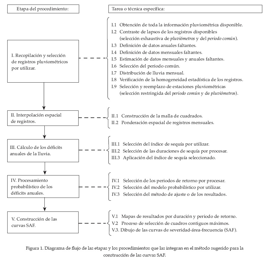 La estimación de las curvas SAF para analizar sequías meteorológicas implica procesar los registros de precipitación mensual con base en las siguientes cinco etapas para su establecimiento: (1) recopilación y selección de registros a utilizar; (2) interpolación espacial de registros; (3) cálculo de los déficits anuales de lluvia; (4) procesamiento probabilístico de los déficits anuales, y (5) construcción de las curvas SAF. En la figura 1 se muestra el diagrama de flujo de las etapas citadas, y se detallan los análisis o procedimientos específicos que incluyen.