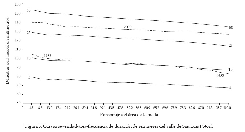 Las curvas de severidad-área-frecuencia (SAF) se pueden construir en una cuenca o región previamente definida, para diversas duraciones de la sequía, por ejemplo 12, 6, 3 y 1 meses. Tales curvas mostrarán la intensidad de las sequías de acuerdo con el índice seleccionado y utilizado en su estimación; además, caracterizarán a las sequías en relación con el modelo de comportamiento espacial establecido por las predicciones procedentes del índice empleado. Las curvas SAF de una cuenca o región permiten su comparación con otras para apreciar sus diferencias, sean éstas en intensidad o en comportamiento espacial.