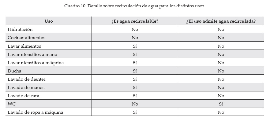A continuación se analizan los volúmenes de agua que pueden ser recirculados, como también la demanda por agua recirculada. El uso del sanitario puede incorporar agua de una calidad menor incluso (GWP, 1998) (cuadro 10).