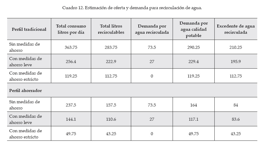 Para cada perfil de consumo (tradicional y ahorrador, con y sin medidas de ahorro), se procede a calcular cuánta del agua utilizada es recirculable y cuánta agua recirculada podría ser utilizada; es decir, oferta y demanda del agua recirculada. Para este cálculo se utilizan los datos del cuadro 9, y se discrimina la disponibilidad de agua para recirculación y el uso de agua recirculada según los criterios del cuadro 10. En el cuadro 11 se presenta como ejemplo el cálculo para el caso del perfil tradicional sin medidas de ahorro.