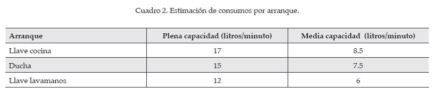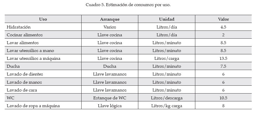 A partir de cada arranque se definen unidades comparables, como "litros por descarga de estanque de WC" o "litros por minuto de ducha", a fin de poder comparar los distintos consumos y así sistematizar la información de consumo en litros de agua (cuadro 1).