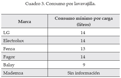 Para el caso de los lavavajillas, se utilizaron los valores encontrados en la revisión de los manuales de distintos fabricantes de lavavajillas (cuadro 3).
