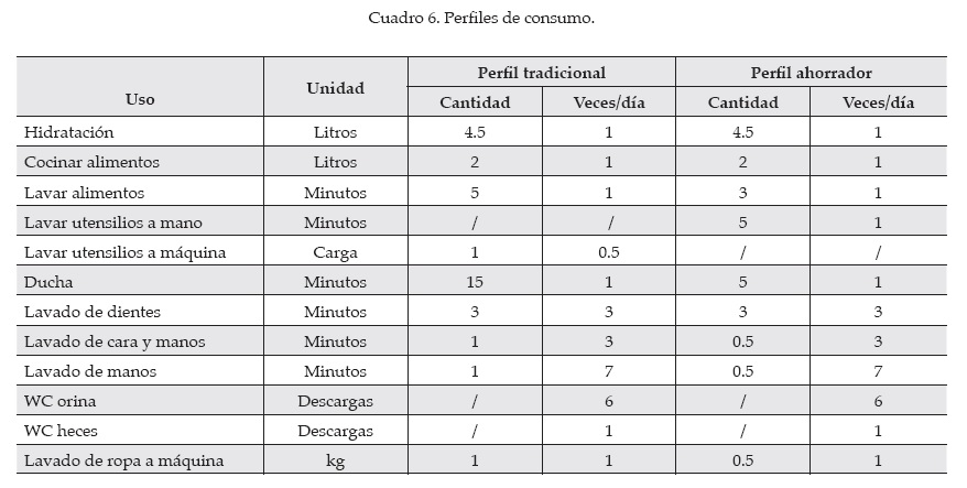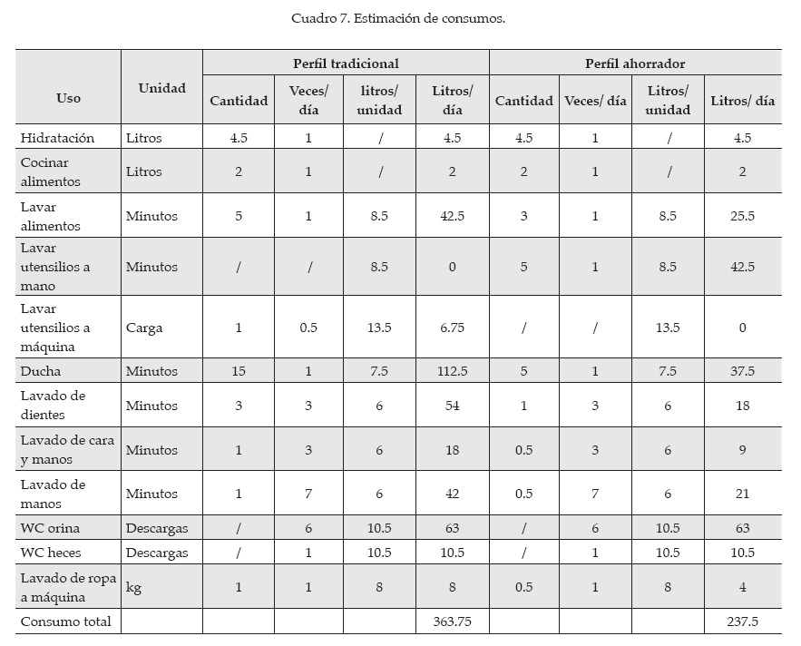 Con estos perfiles definidos se procede a calcular los gastos en litros que se consumen por día. Tomando los valores propuestos en el cuadro 5, los resultados son los que se presentan en el cuadro 7.