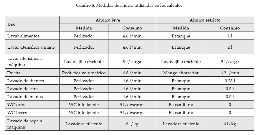 Para comparar los ahorros potenciales se sistematizaron las distintas opciones de ahorro (el detalle de las medidas estudiadas se encuentra más adelante en el "Apéndice: medidas de ahorro"). La medida de ahorro "estanque" se refiere a utilizar algún tipo de estanque o recipiente que acumule agua y se utilice en dicho uso, ya sea un vaso, olla, palangana, etcétera. Se definen dos perfiles de ahorro: uno de ahorro leve y uno de ahorro estricto (cuadro 8).