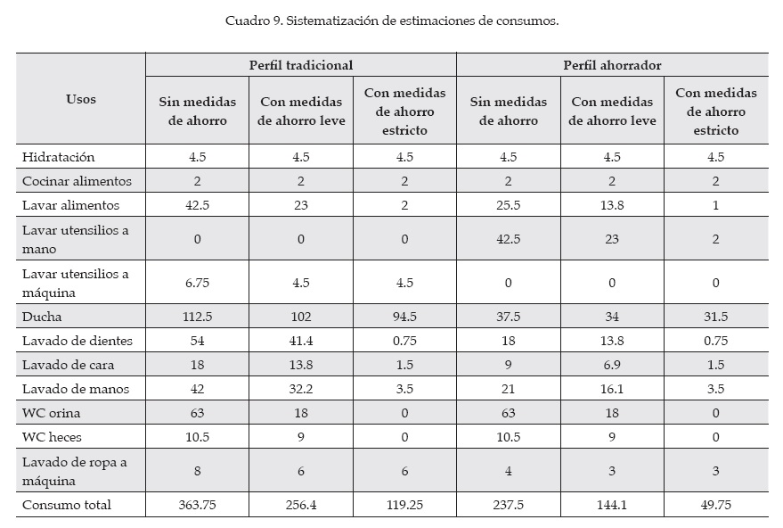 A continuación se procede a calcular los consumos de los perfiles tradicional y ahorrador con las medidas de ahorro estrictas y leves. Para el caso de la medida "estanque", se considera que el consumo es fijo, ya que no depende del tiempo que toma la operación. Los resultados se tienen en el cuadro 9.